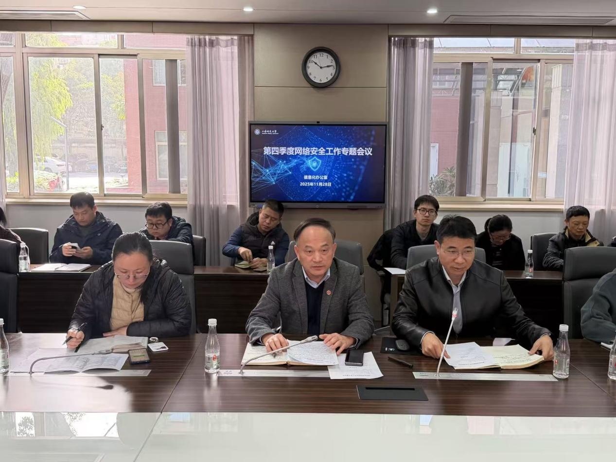11月28日上午,学校2025年第四季度网络安全工作专题会议在徐汇校区外宾楼101会议室召开。学校信息化办公室班子成员及网络安全技术人员、部分学院及职能部门分管信息化工作领导及网络信息员参加会议。会议由信息化办公室主任顾益明主持。